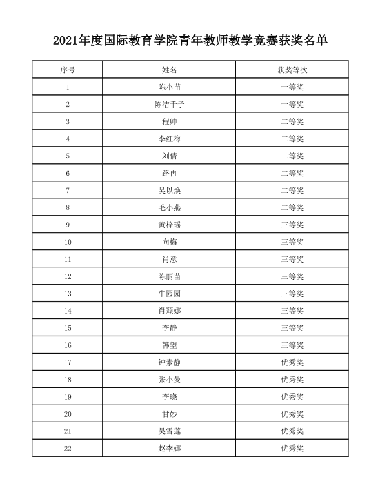 为选拔教学能手参加2022年度bevictor1946韦德官网青年教师教学竞赛,国际教育公司特举办2021年度青年教师教学竞赛活动。获奖名单公示如下。